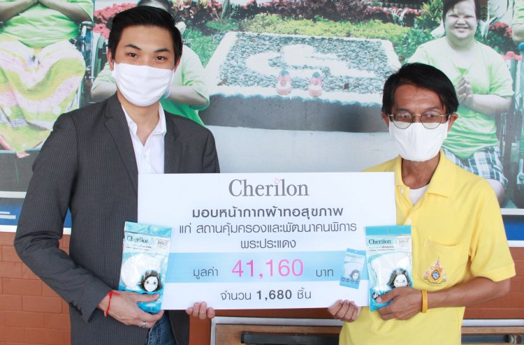 เชอรีล่อน เดินทางไปมอบ หน้ากากผ้าทอเพื่อสุขภาพ จำนวน 1,680 ชิ้นมูลค่ารวม 41,160 บาท ให้แก่ สถานคุ้มครองและพัฒนาคนพิการพระประแดง เพื่อนำไปแจกจ่ายให้ผู้พิการได้นำไปใช้ โดยมี คุณสัญญา ประสงค์เจริญ (ขวา) เจ้าพนักงานสังคมชำนาญงาน เป็นผู้รับมอบ